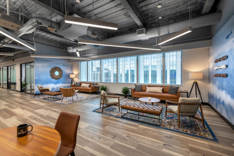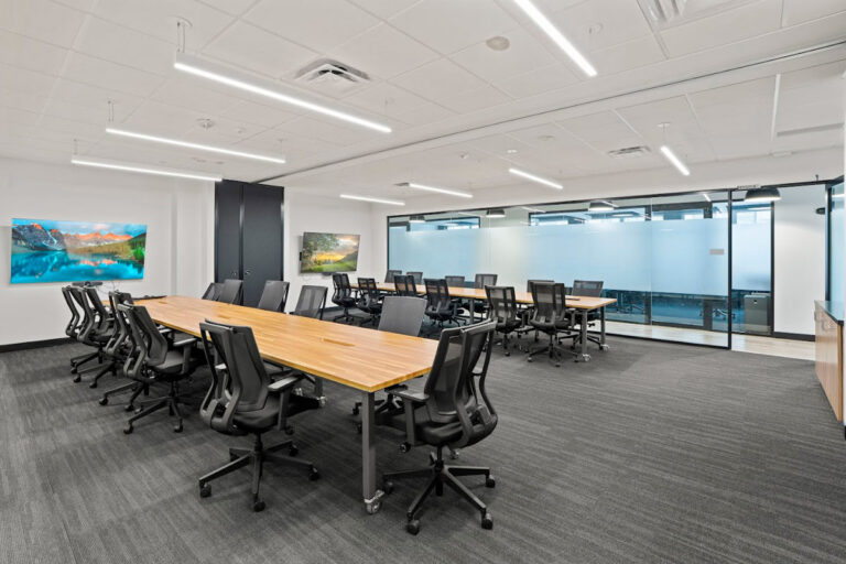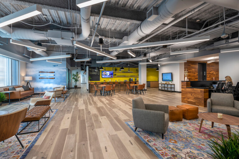 The modern design features high exposed ceilings with an industrial loft aesthetic and floor-to-ceiling windows. A large lounge area doubles as an event space for up to 100 guests, and there’s an on-site café. The offices are designed with privacy and security in mind, featuring frosted windows and tailored for security-conscious clients (both in terms of IT systems and physical spaces). Each office is quiet, spacious, and offers more square footage per person than any other flexible office space on the market. Additional features include hi-tech meeting rooms, high-speed fiber internet, dedicated LANs, and more.